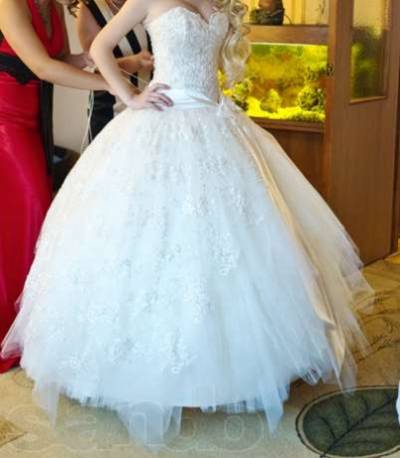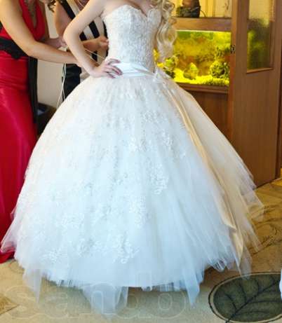 Великолепное свадебное платье без бретелек. Платье прекрасно подчеркивает линии и изгибы тела. Элегантные оборки на юбке добавляют торжественности. Легкая ткань из органзы дарит этому свадебному образу изысканность и утонченность. В платье удобно ходить, тк оно не заужено к низу. Платье на подкладке. Сзади на молнии. Внутри лифа расположен бюстгальтер для лучшей поддержки груди. Покупалось в июне 2012г. После хим.чистки. повреждений нет. Купила за 33 000-00. 8 926 272 40 06 Елена