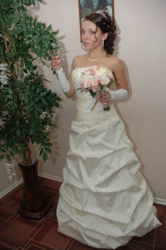 Продаю свадебное платье, размер 50 (лиф примерно на размер груди С, длина - на рост 165 см будет по щиколотку). Лиф и часть юбки расшиты декоративными аппликациями и бисером (см. фото). Сзади шнуровка, спина закрыта (не декольте), молния сбоку. Платье атласное, внизу юбка из фатина с пластиковым кринолином. Прилагается чехол, в который платье компактно убирается. Надевано один раз, не порвано, не испачкано (только доехали до ЗАГСа в автомобиле - не гуляла, не пьянствовала в нем ;-)) Сама покупала за 20 000, так что скидка приличная, соответственно, без торга! Замеры: ширина по линии груди (от подмышки до подмышки): 52 см, длина по спинке 130 см. Продам первому, кто приедет забирать, не откладываю!!! В подарок очень нежная фата, двухслойная, длинная.